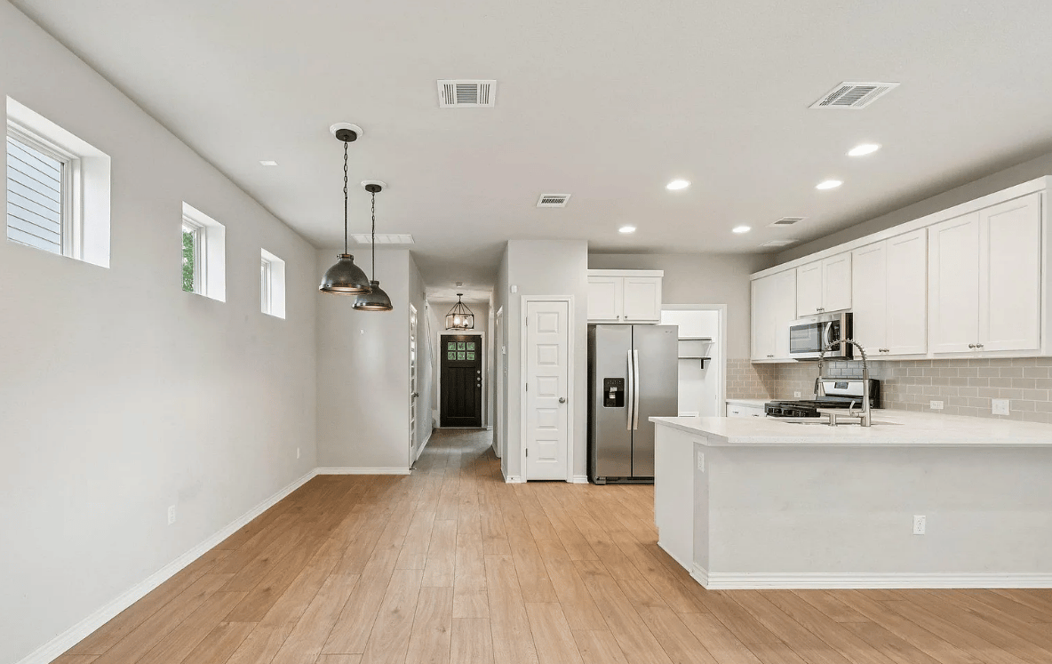 The 1,792 square foot interior features three bedrooms and two and a half bathrooms across two levels. Recently installed vinyl plank flooring brings durability and warmth to the main living areas, while stainless steel appliances and quartz countertops elevate the kitchen’s clean, contemporary feel. The kitchen connects easily to the dining and living spaces, supporting everyday routines and casual entertaining.