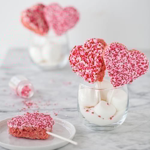 These rice krispie Valentine lollipops turn classic marshmallow cereal treats into adorable heart-shaped pops dipped in vanilla coating and showered with festive sprinkles. They’re sweet, simple, and so fun to decorate that a little sprinkle mess is part of the charm!