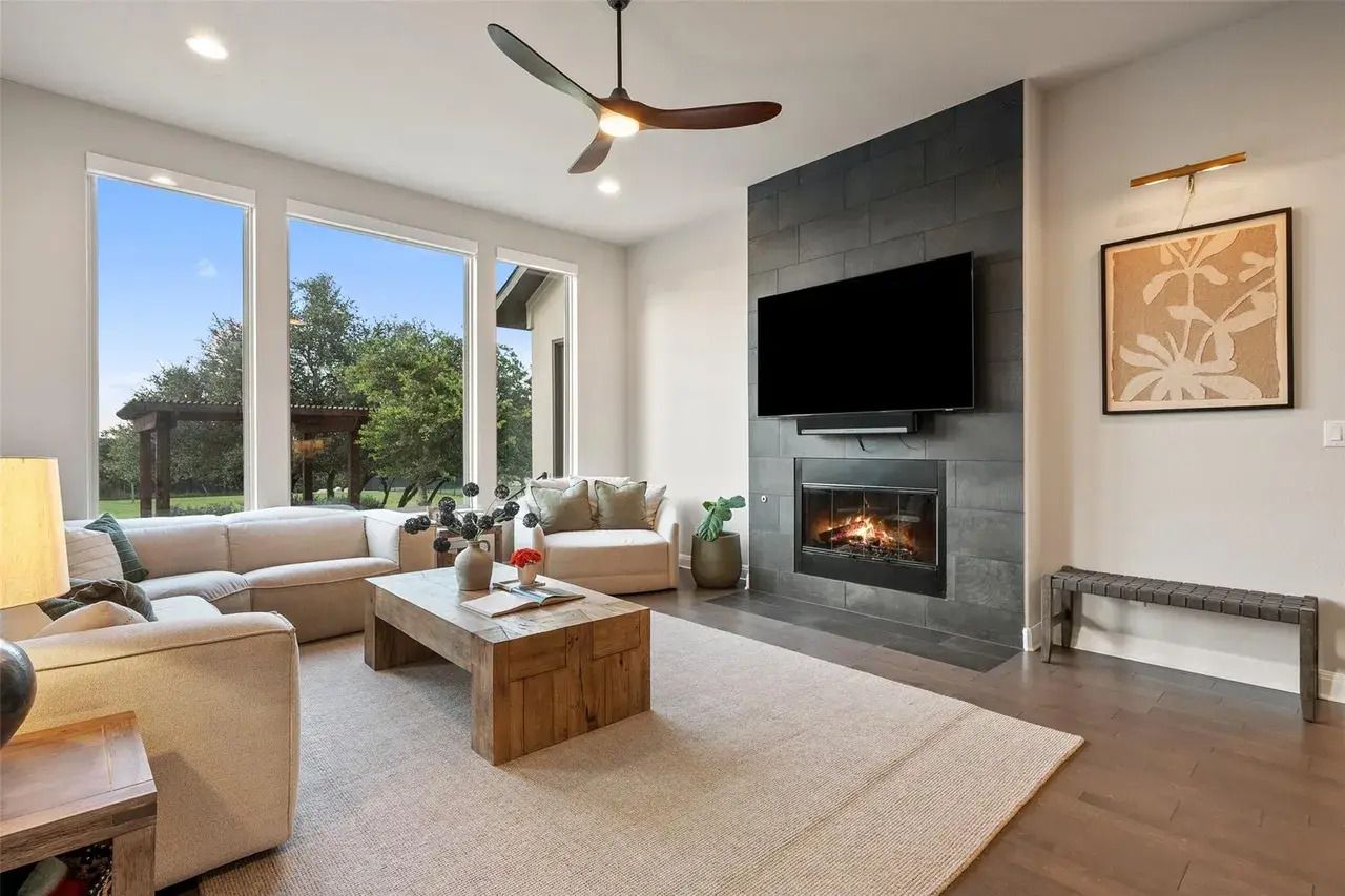 The main level owner’s retreat was designed to feel peaceful. It offers long Hill Country views, a spa like bath with an oversized dual entry shower, separate vanities, a soaking tub and a boutique style dressing room with direct access to the laundry room. A second bedroom with en suite bath on the main floor provides easy guest or multigenerational space.
