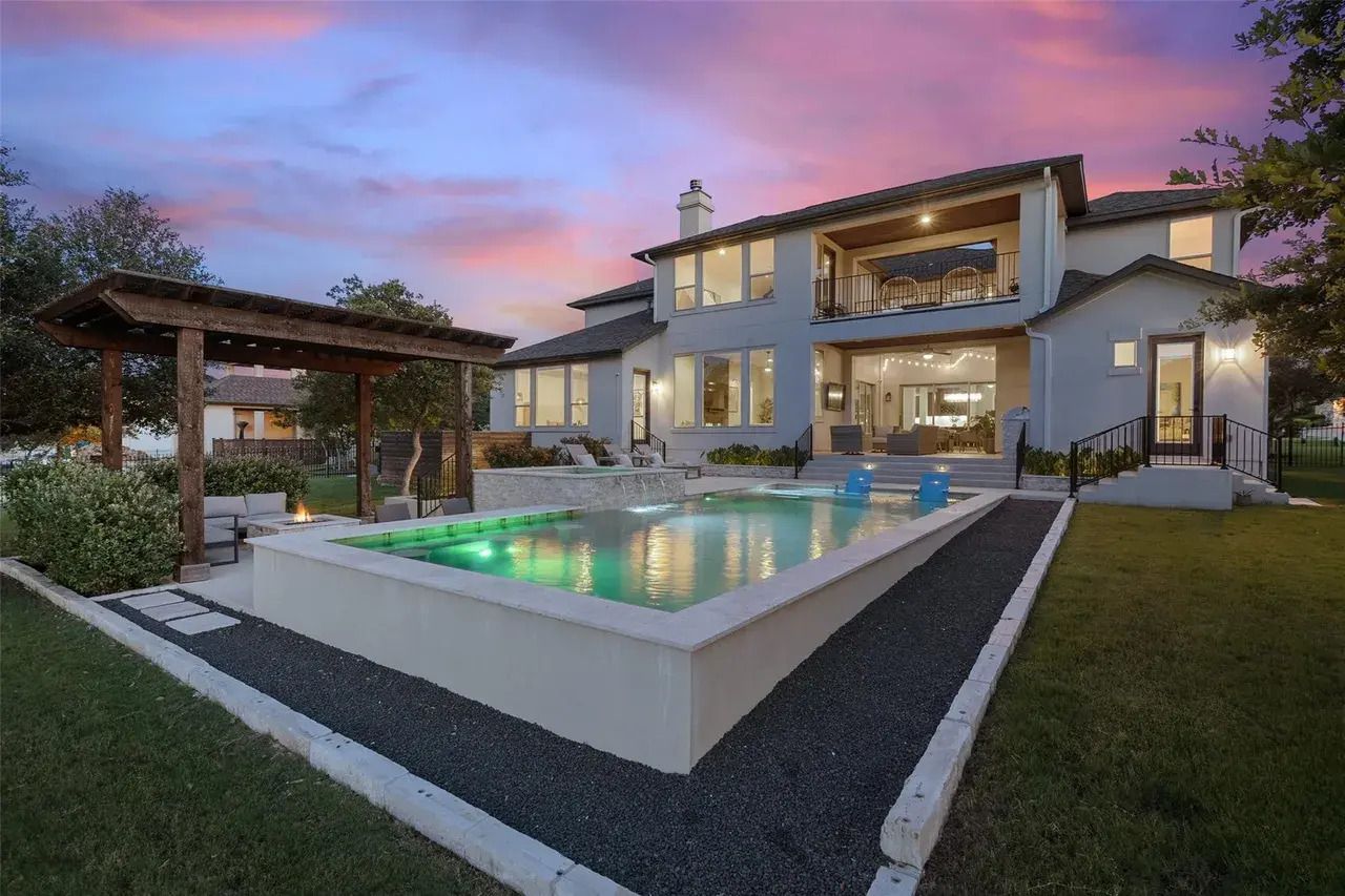 The backyard is a true highlight. A private courtyard opens to the covered patio with an outdoor kitchen featuring Bull appliances and built in speakers. The resort style pool includes a tanning deck, submerged barstools and a relaxing spa with waterfall features. A pergola covered fire pit sits nearby and offers another spot to enjoy evenings outdoors.