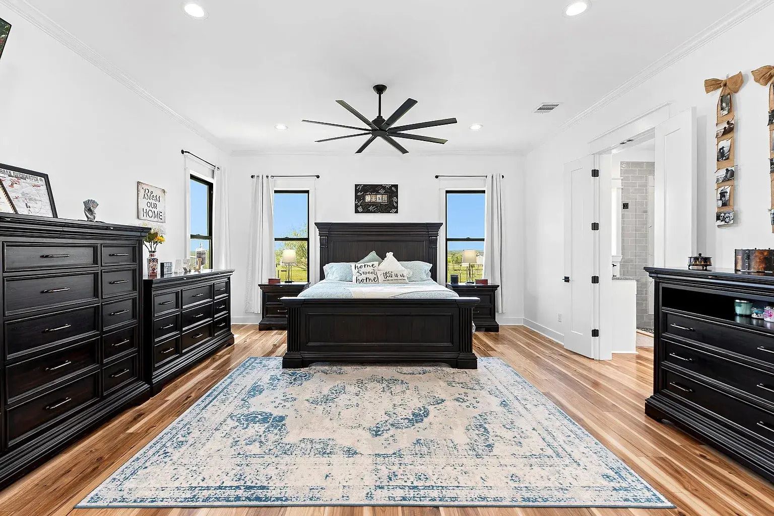 The home offers four spacious bedrooms, including dual primary suites for flexibility and privacy. Each bathroom features custom tilework, upgraded trim, and elegant finishes. Additional living spaces include a dedicated media or game room for entertaining and relaxation. Throughout the home, man-height counters, crown molding, and vinyl plank flooring add to the thoughtful design and livable luxury.