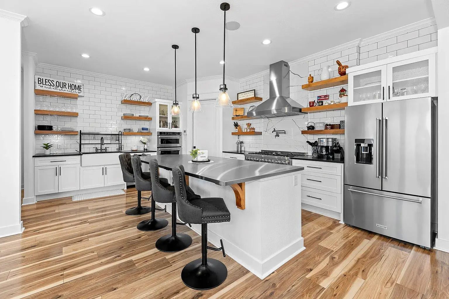 Step inside to a stunning open floor plan featuring 10-foot ceilings, Andersen windows, and 8-foot doors throughout. The vaulted great room makes a dramatic impression with an exposed beam, wood stove, and whole-home surround sound. The chef’s kitchen is a true centerpiece, showcasing a pro-grade gas stove, pot filler, custom stainless-steel island and vent hood, and a walk-in pantry with glass door.