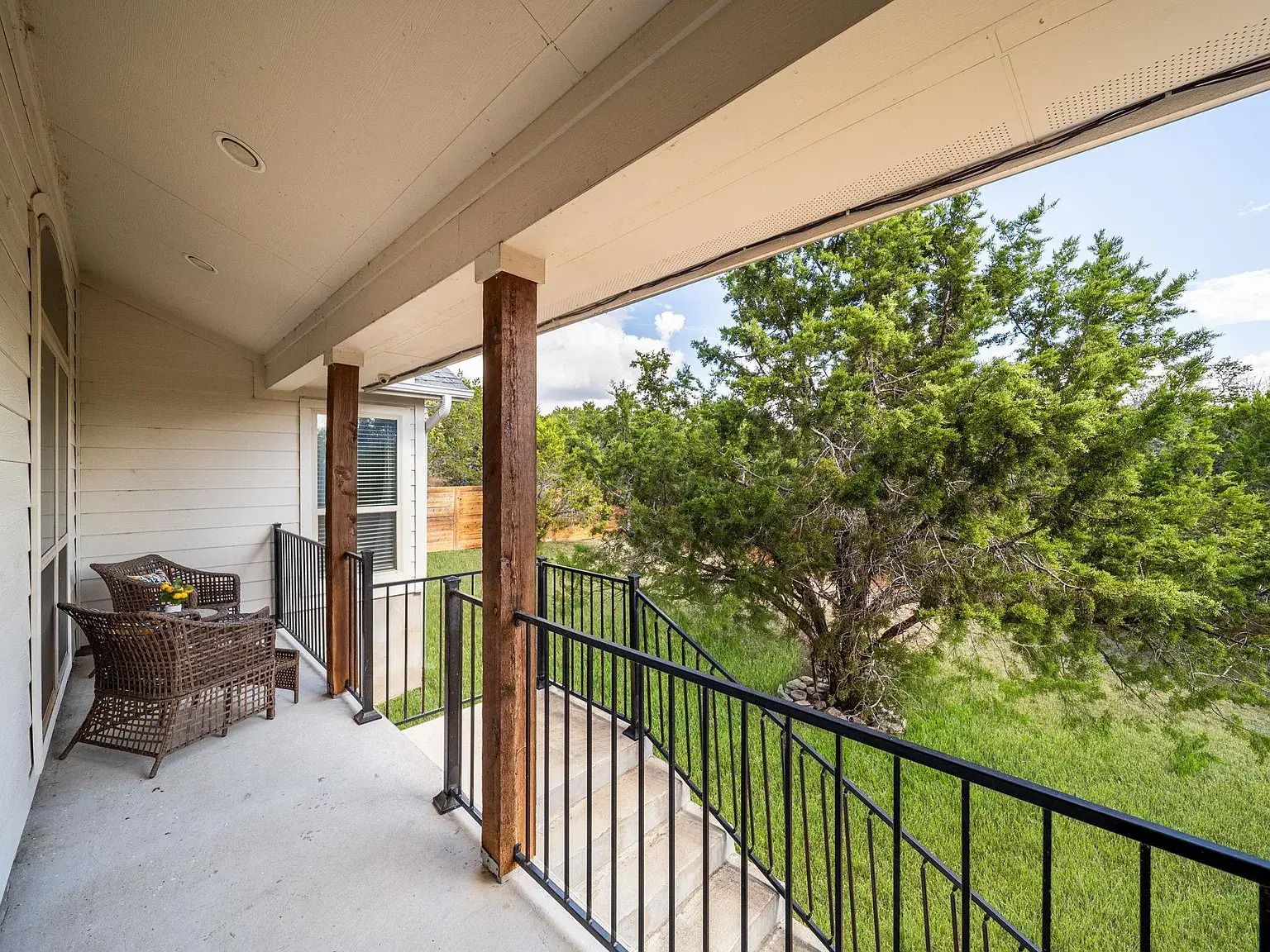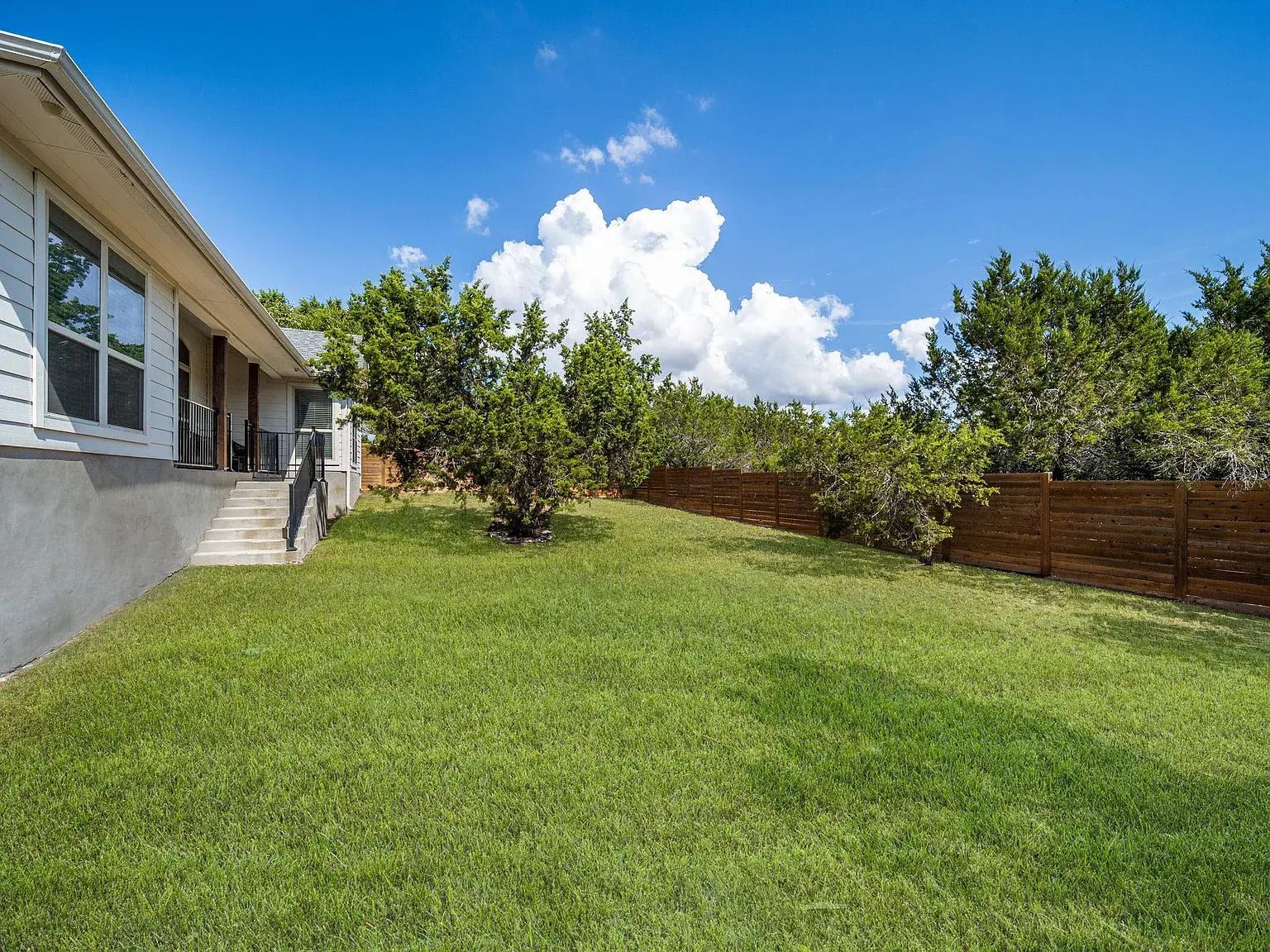 The level backyard is ready for play or entertaining, bordered by mature trees and backed by peaceful green views. Residents enjoy access to Lago Vista POA amenities including multiple lake parks, boat ramps, two fitness centers, a pool, tennis and pickleball courts, and vibrant community events year-round.