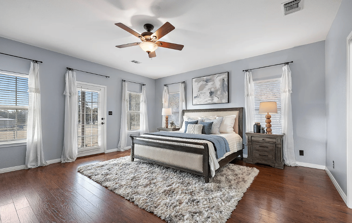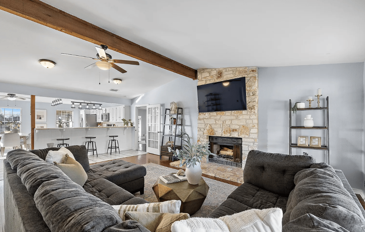 Spanning approximately 3,700 square feet, the home is thoughtfully designed for comfortable, multi-generational living. With six bedrooms and four full bathrooms, including three private primary suites with en suite baths, the layout provides exceptional flexibility. Interiors are filled with natural light thanks to expansive windows that frame views of the surrounding acreage. Wood and tile flooring, beamed and vaulted ceilings, granite countertops, and stainless steel appliances add warmth and timeless appeal. Multiple living and dining areas are anchored by two striking stone fireplaces, creating inviting spaces for gathering or quiet evenings at home.